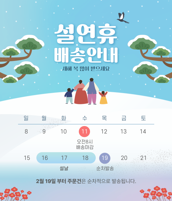 - 평일(월~금) 오전 8시 전까지 주문/결제 완료시 바로 다음날 수령가능합니다.